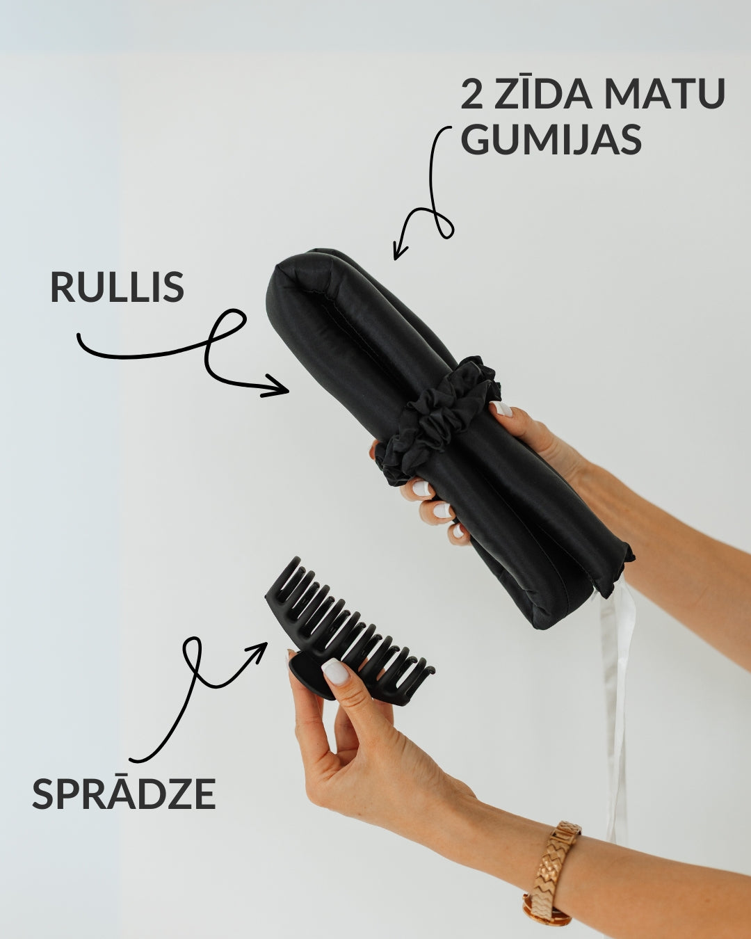 - Komplektā iekļautas divas S izmēra zīda matu gumijas, uzglabāšanas maisiņš, lietošanas instrukcija, grezna kastīte un