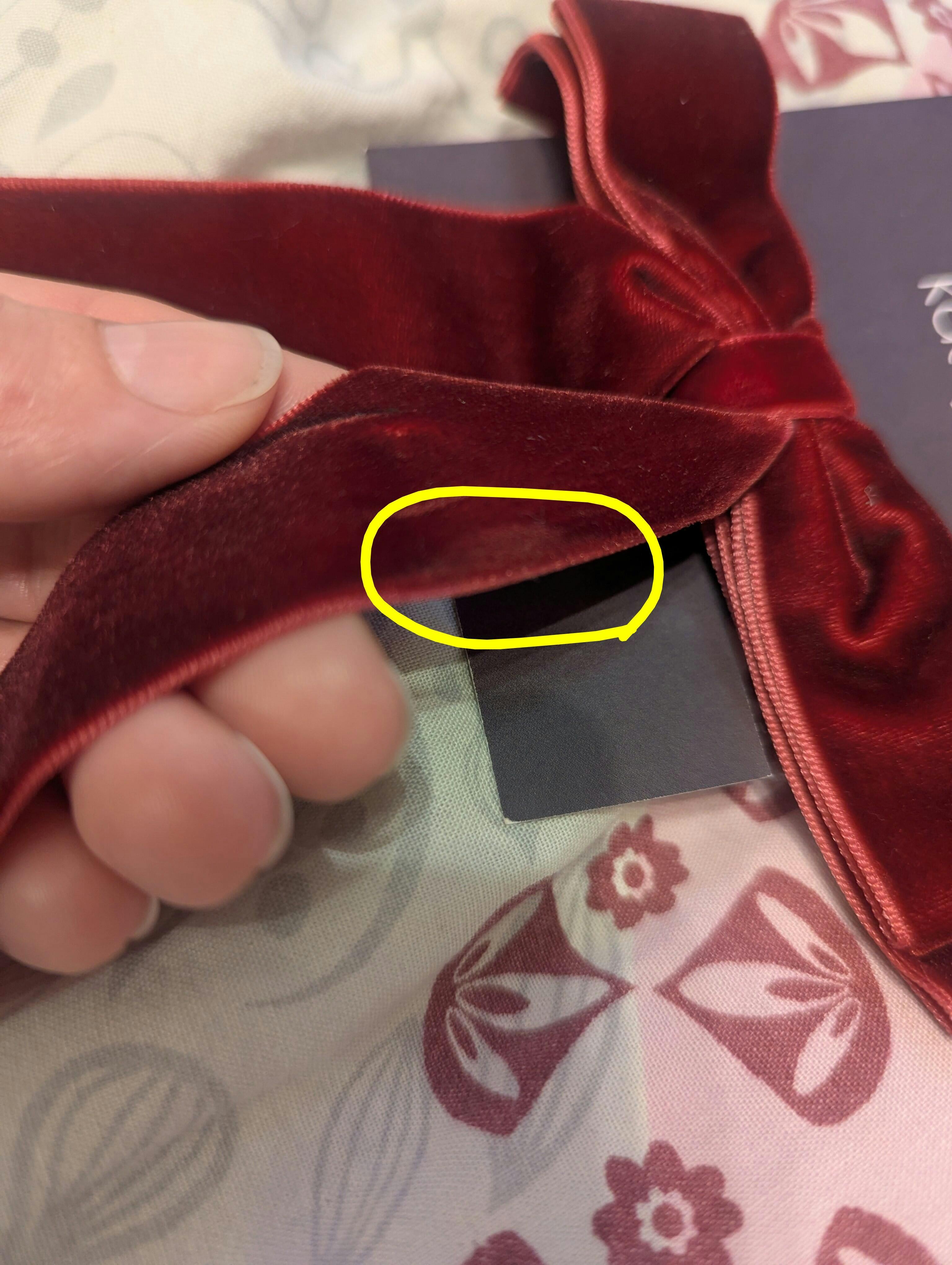 Kopumā skaista bante, tomēr vienai lentei sānā gana labi redzams līmes traips (iespējams, līme, jo ar mitru drāniņu notīrīt neko neizdevās un traips stāv kā stāvējis). Sākumā domāju sūtīt atpakaļ taču sapratu, ka skrējienā neko nepaspēšu. Tad nu - kā ir, tā ir..