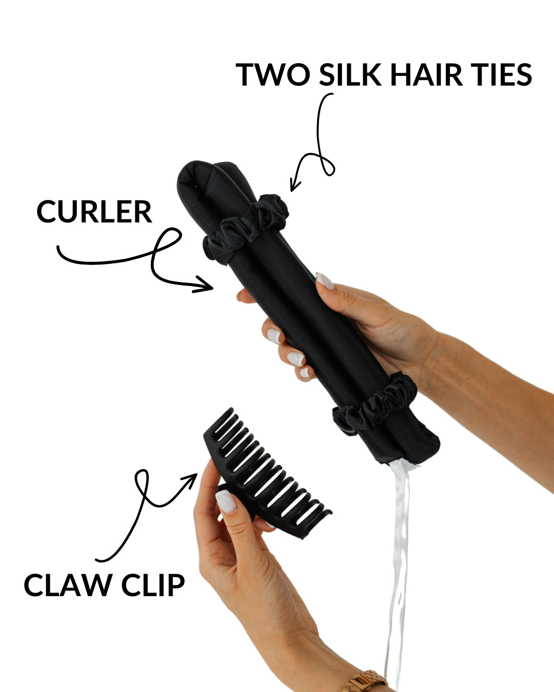 The Ultimate Curler Set: Complete with Curler, Claw Clip, and 2 Silk Hair Ties.